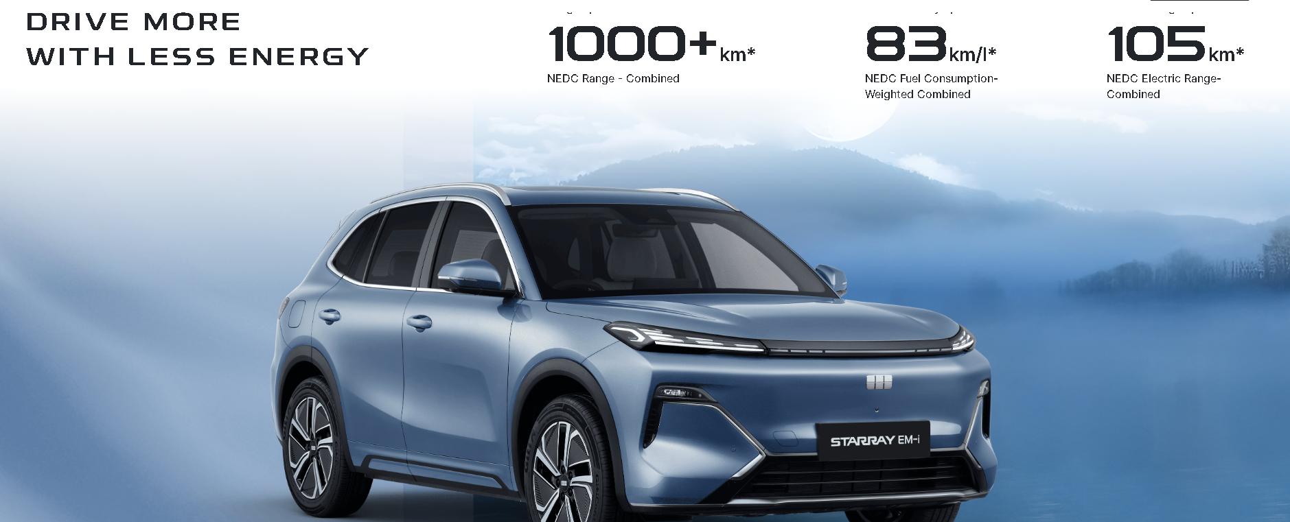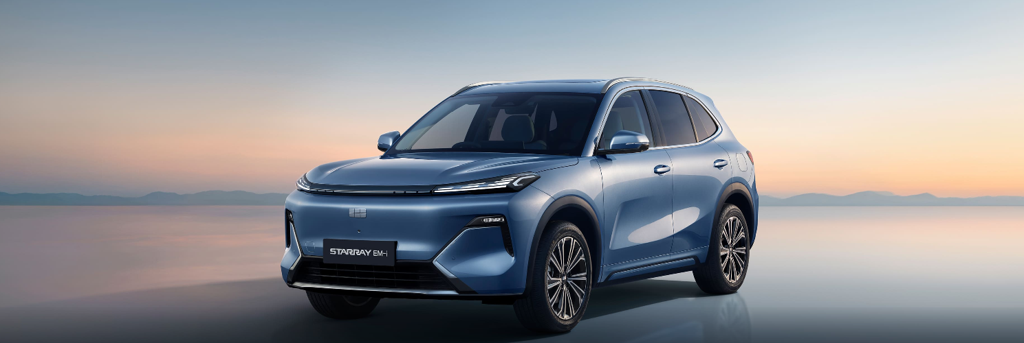 Geely Starray EM-i dirancang dengan gaya SUV plug-in hybrid modern: gril depan yang aerodinamis dan styling futuristik, lampu depan LED dan DRL yang tajam, serta bodi dengan proporsi panjang dan lebar ideal untuk kenyamanan dan pengerahan ruang interior. Velg alloy berukuran 18 inci dengan ban berprofil lebar (245/45 R18) menambah kesan sporty. Dimensi mobil (P x L x T) sekitar 4740 × 1905 × 1685 mm, jarak sumbu roda 2777 mm.
