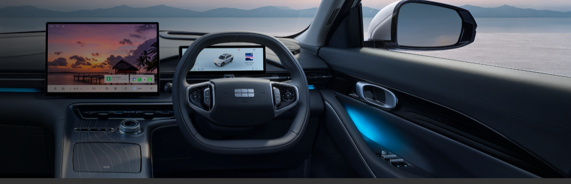 Dashboard tengah menampilkan layar sentral besar berukuran 15,4 inci yang menjadi pusat sistem infotainment berbasis Flyme Auto, menawarkan pengalaman interaktif dan konektivitas penuh ke smartphone.